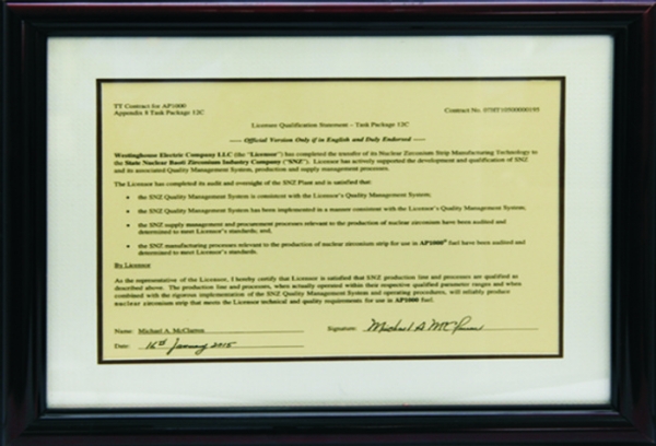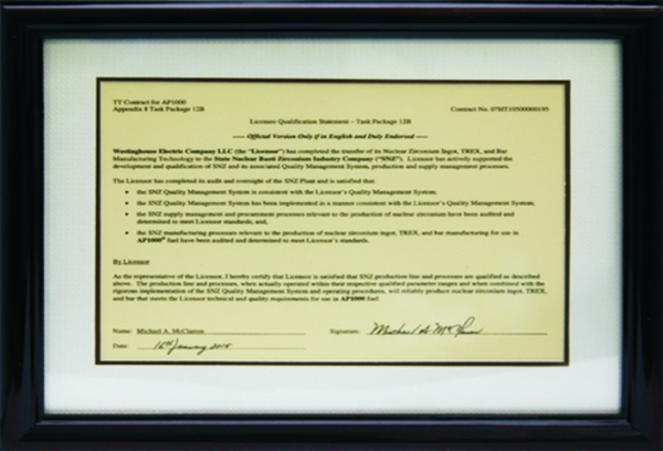 國(guó)核鋯業(yè)獲得西屋電氣公司頒發(fā)的AP1000核級(jí)鋯材生產(chǎn)線鑒定證書(shū)