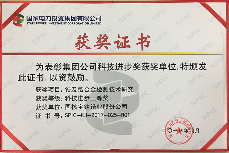 國核寶鈦鋯業股份公司《鋯及鋯合金檢測技術研究》項目獲國家電力投資集團科技進步三等獎
