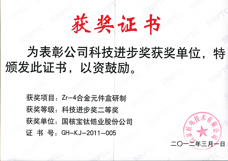 國核寶鈦鋯業(yè)股份公司《Zr-4合金元件盒研制》獲2011年度國家核電技術公司科技進步二等獎