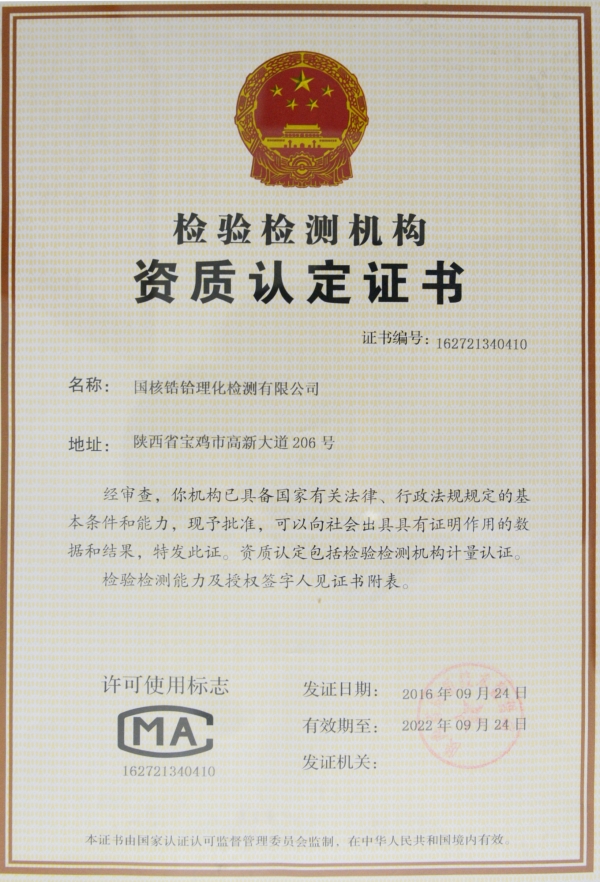 國核鋯業所屬國核鋯鉿理化檢測有限公司檢驗檢測機構資質認定證書