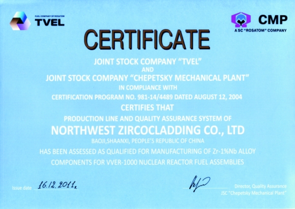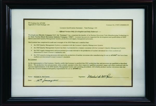 國核鋯業獲得西屋電氣公司頒發的AP1000核級鋯材生產線鑒定證書